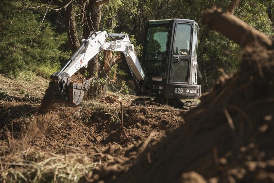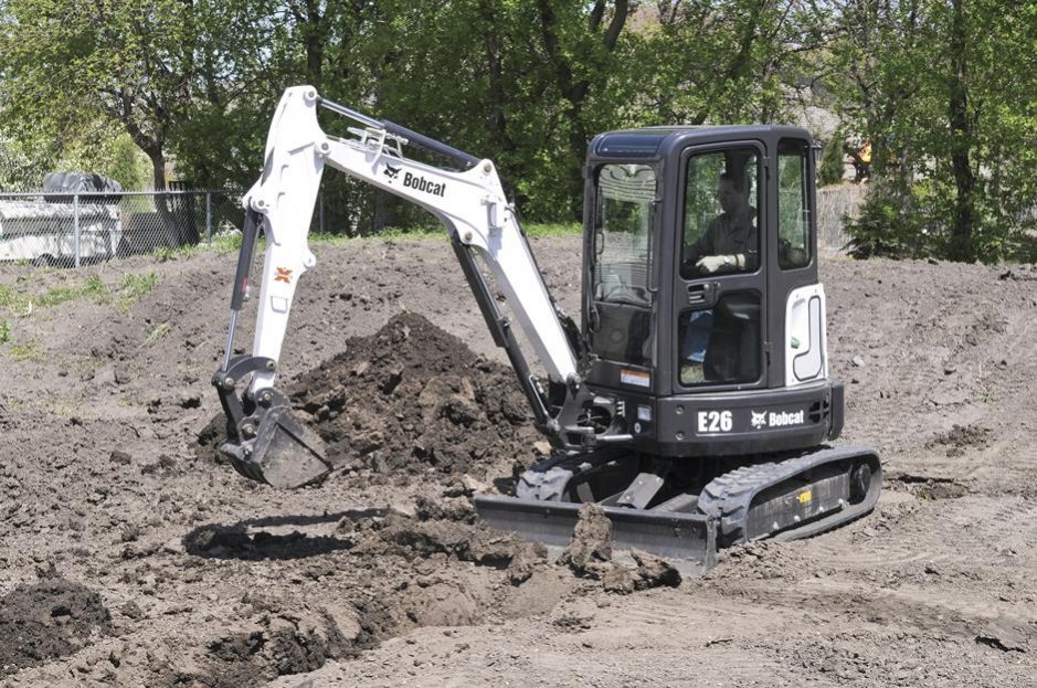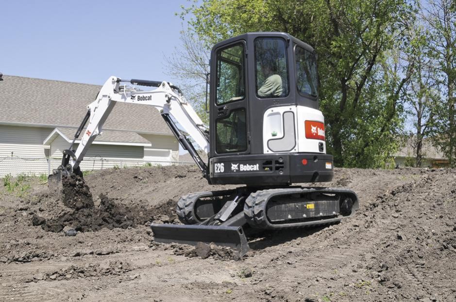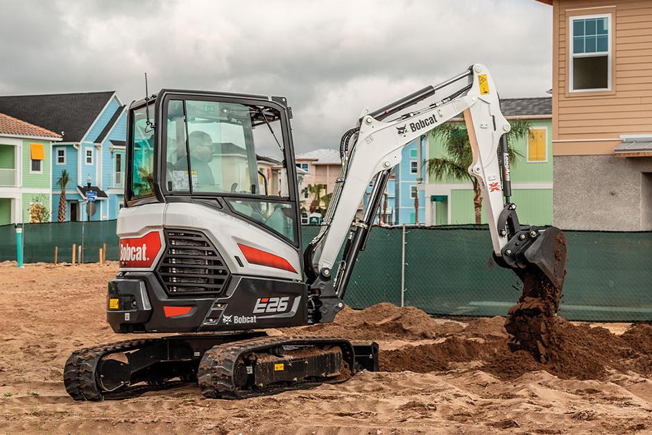 The Bobcat® E26 compact excavator (mini excavator) features minimal tail swing to reduce the risk of damage to your machine and surrounding objects. With its compact size and excellent flotation, the Tier 4-compliant E26 easily maneuvers established lawns, crowded jobsites and sensitive surfaces. The E26 is also available in a long arm model.