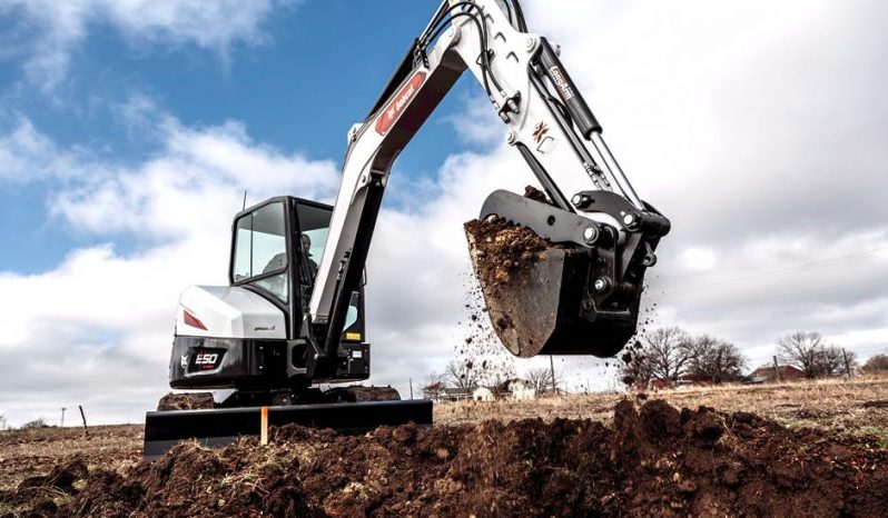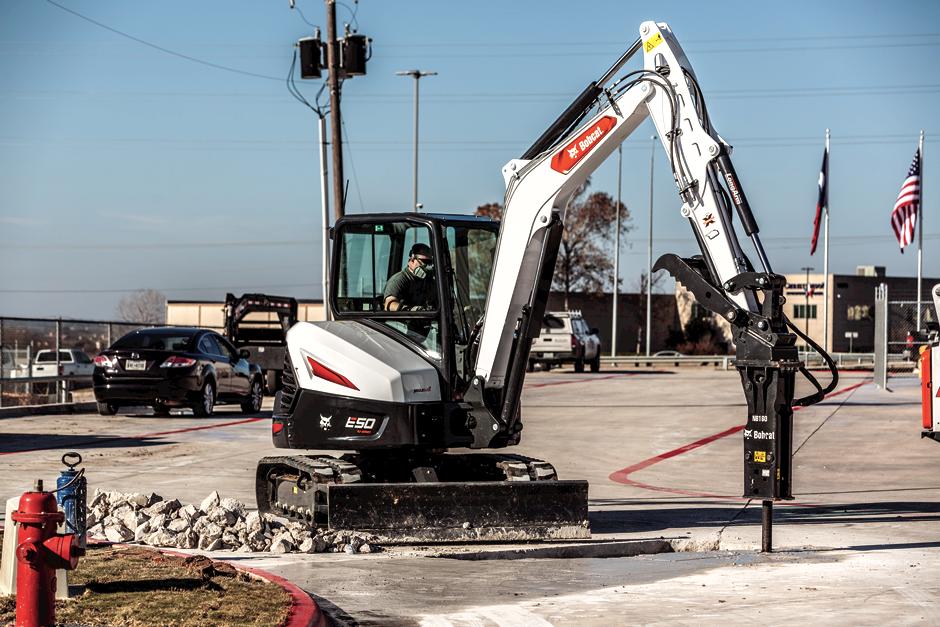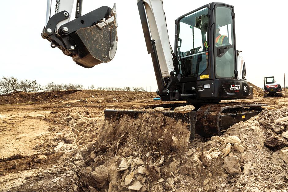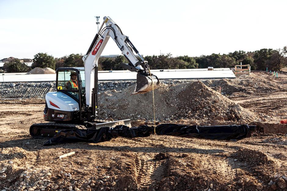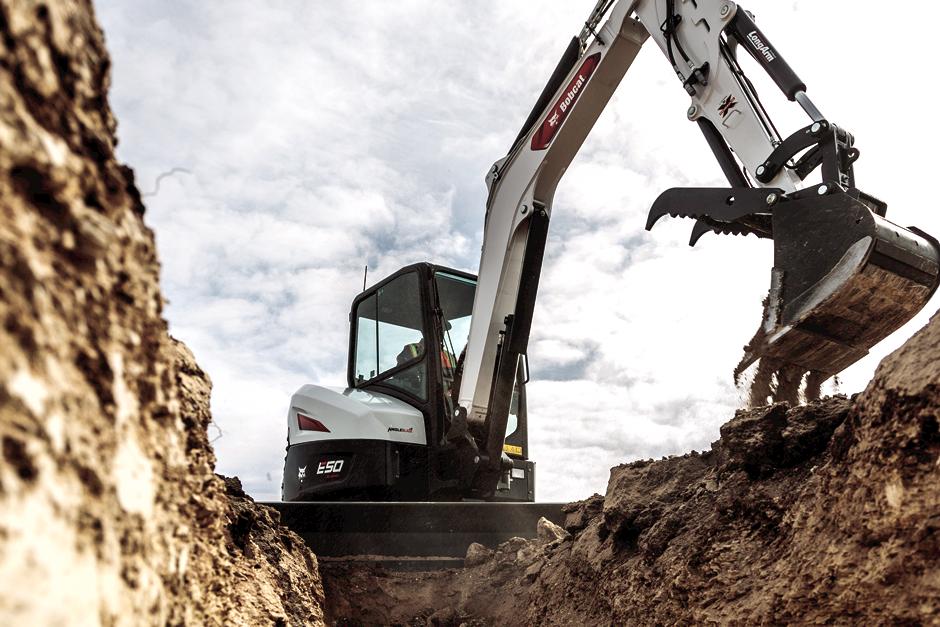 The powerful E50 R2-Series compact (mini) excavator helps you push the limits of productivity with enhanced hydraulic performance, improved efficiency, simplified maintenance and more precise control. It features a minimal tail swing of less than one inch of overhang to ensure easy work in tight areas. It can be equipped with a long arm to increase dig depth and reduce the frequency of repositioning the excavator.