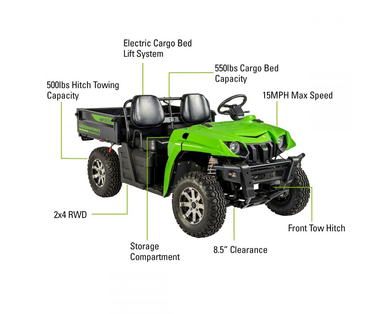 Heavy Lifting. With a front hitch with electric take-off (ETO) power port, back hitch capacity of 500 lbs., and a cargo hauling capacity of 550 lbs. this machine was built to handle the heaviest loads on the job.