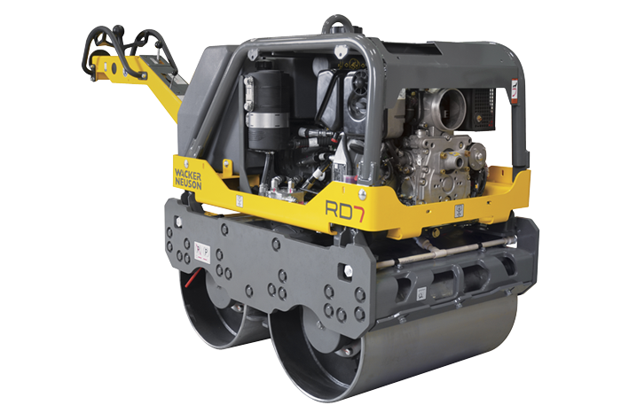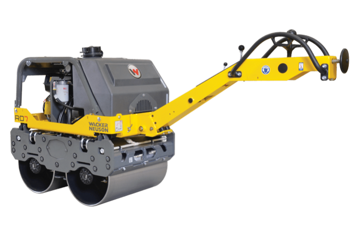 The RD 7 walk-behind double drum vibratory rollers (tandem) are easy to maneuver while performing a wide range of soil and asphalt compaction applications. The exclusive compact design allows for tight side clearance on both sides of the roller. These versatile rollers, offer dual smooth drums with beveled edges to effectively compact asphalt and granular materials. The totally hydrostatic drive provides for less maintenance and greater reliability. Available with the choice of gasoline or diesel engines. Optional protection guard kit also available.